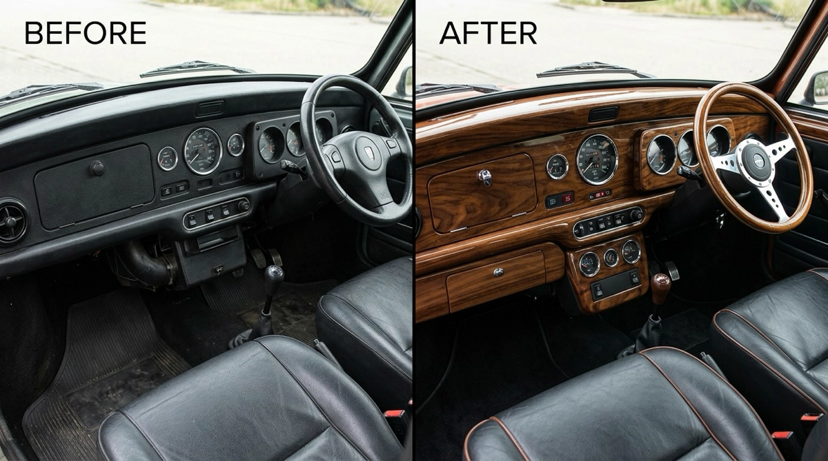 ローバーミニにウッドパネルを取り付けると、内装が一変します