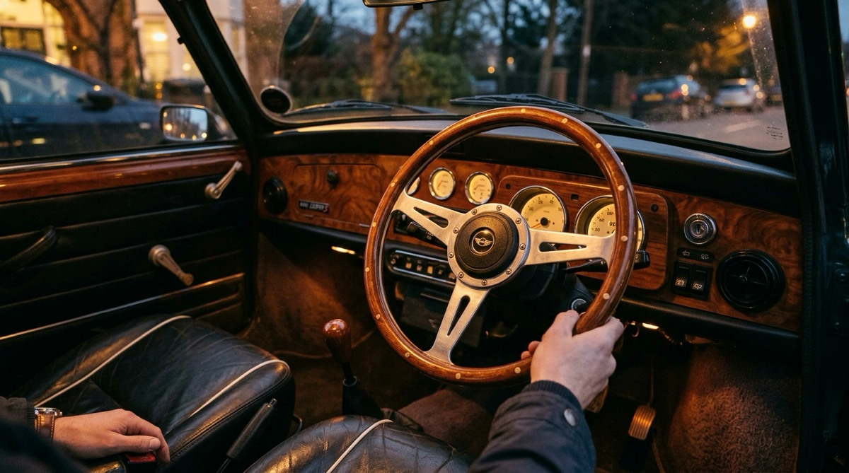 ウッドステアリングを取り付けた瞬間、ミニの内装がひとつ上の次元になります。純正のプラスチックステアリングも決して悪くはないのですが、木目調のリムが視界に入るだけで、ブリティッシュクラシックカーらしい雰囲気が一気に増します。